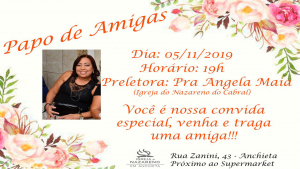 Data: 05/11 Horário: às 19h Preletora: Prª. Angela Maia ( Igreja do Nazareno do Cabral )