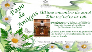 Data: 03/12 Horário: às 19h Preletora: Telma Hilário ( Presidente do Departamento de mulheres da Igreja do Nazareno em Anchieta )