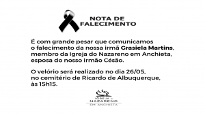 É com grande pesar que comunicamos o falecimento da nossa irmã Grasiela Martins, membro da Igreja do Nazareno em Anchieta, esposa do nosso irmão Césão. O velório será realizado no dia 26/05, no cemitério de Ricardo de Albuquerque, às 15h15.