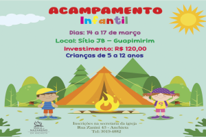 Saída : Igreja do Nazareno de Anchieta Local : Sítio JB - Guapimirim Investimento : 120 Reais Crianças de 5 a 12 anos INSCRIÇÕES NA SECRETARIA DA IGREJA TEL: 3019-4882