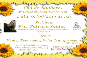Tema: Mentes renovadas, vidas transformadas. (Rm 12.2) Data: 01/06/19 Horário: Às 15H Preletora: Prª Patrícia Santos (Ministério Apostólico Novo Tempo e Nova Terra) Local: Salão Nina's Festas - Rua Inácia Gertrudes, 224 Anchieta