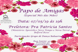 Dia: 07/05/19 Horário: Às 19H Preletora: Prª Patrícia Santos (Ministério Apostólico Novo Tempo e Nova Terra) Participação: Grupo de Dança Baluarte
